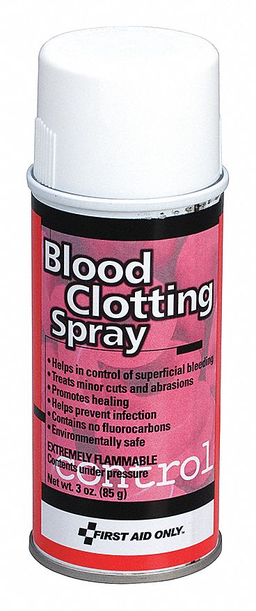 28 May 2014 SECTION 1. Blood Clotting First Aid. Aerosol Can - 1 Each Our blood clotting spray helps control superficial bleeding by forming an immediate porous skin-like film over minor cuts and abrasions. Identification 1a Product identifier trade name. This Medi-First Blood Clotting Spray has an aerosol spray function that is also very strong and aids in spraying a large area very quickly which would certainly come in handy during a first aid emergency. Medique blood clotting spray contains benzethonium chloride 02 ww as a topical antiseptic and lidocaine 4 ww as a pain numbing anesthetic. Identification 1a Product identifier trade name.