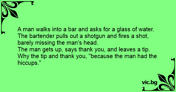 The bartender pulls out a shotgun Dr. Also Read Drunk man comes home riddle and answer. A man walks into a bar and asks the bartender for a glass of water.